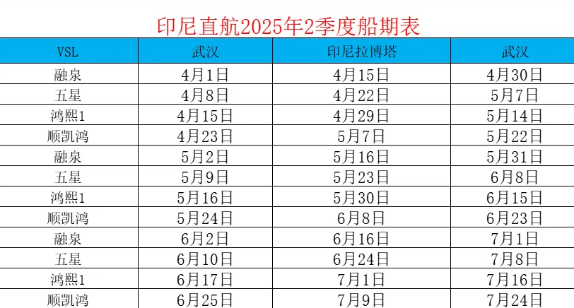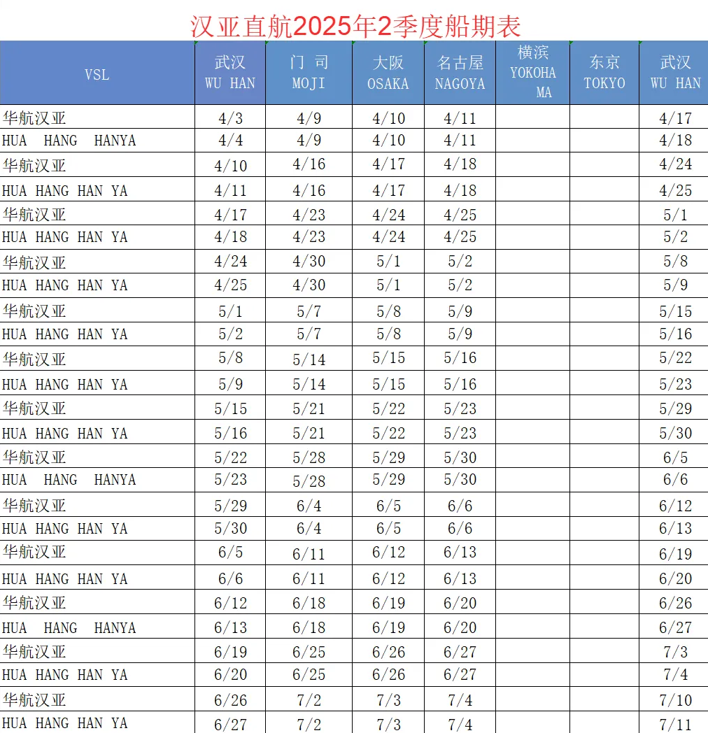 ●国际直航船期表: