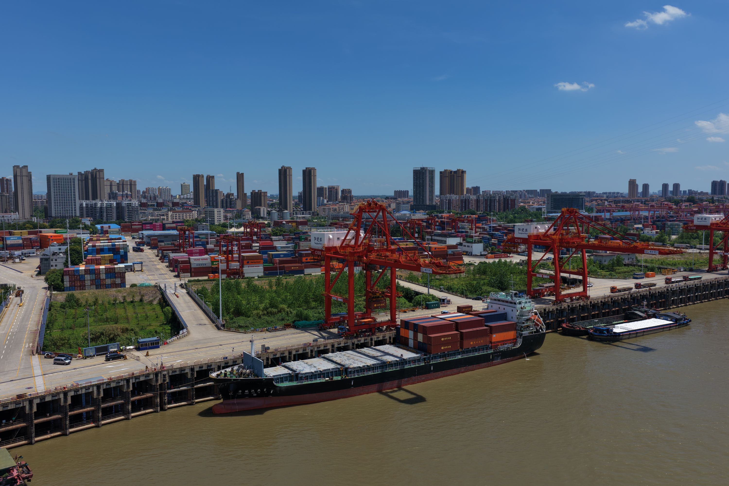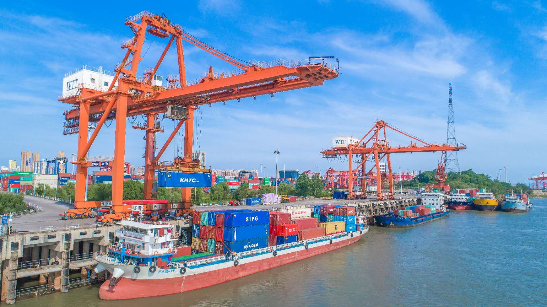 进出口的船舶靠泊阳逻港一期码头。