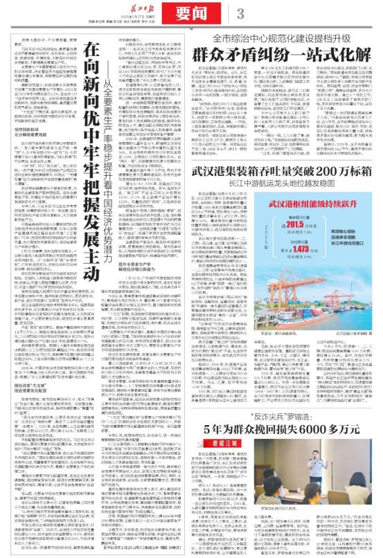 2月27日,长江日报刊发报道《武汉港集装箱吞吐量突破200万标箱 长江中游航运龙头地位越发稳固》,现予转载。