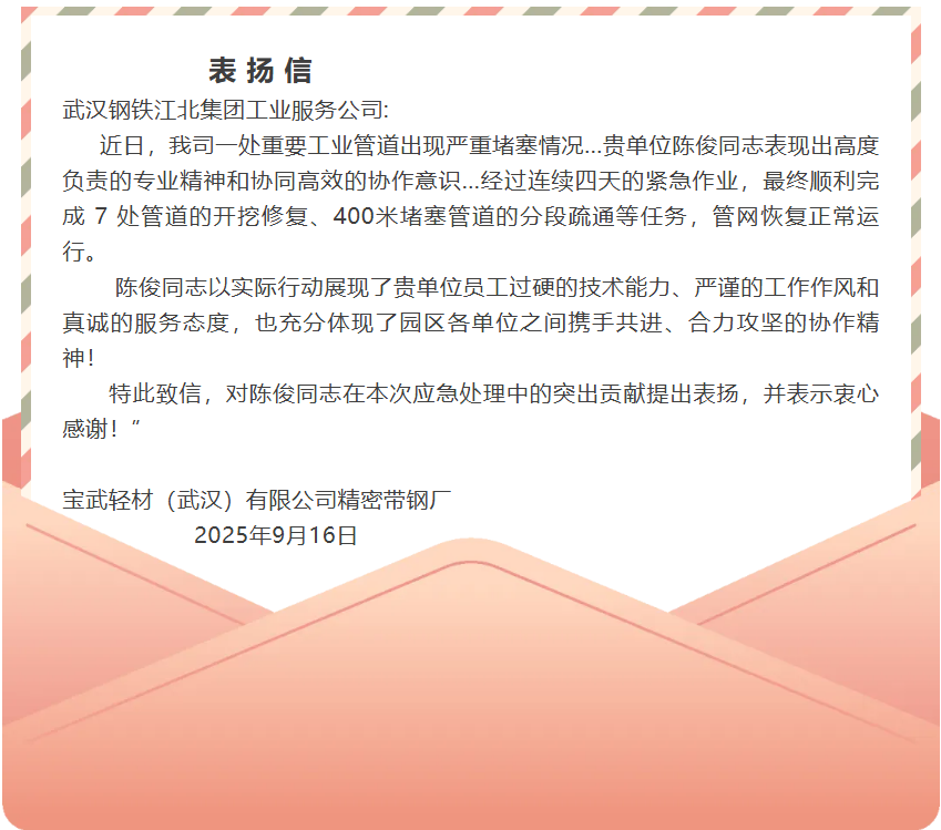 9月16日,负责运营武钢江北阳逻智造园的武汉钢铁江北集团工业服务公司收到一封来自园区企业的表扬信。