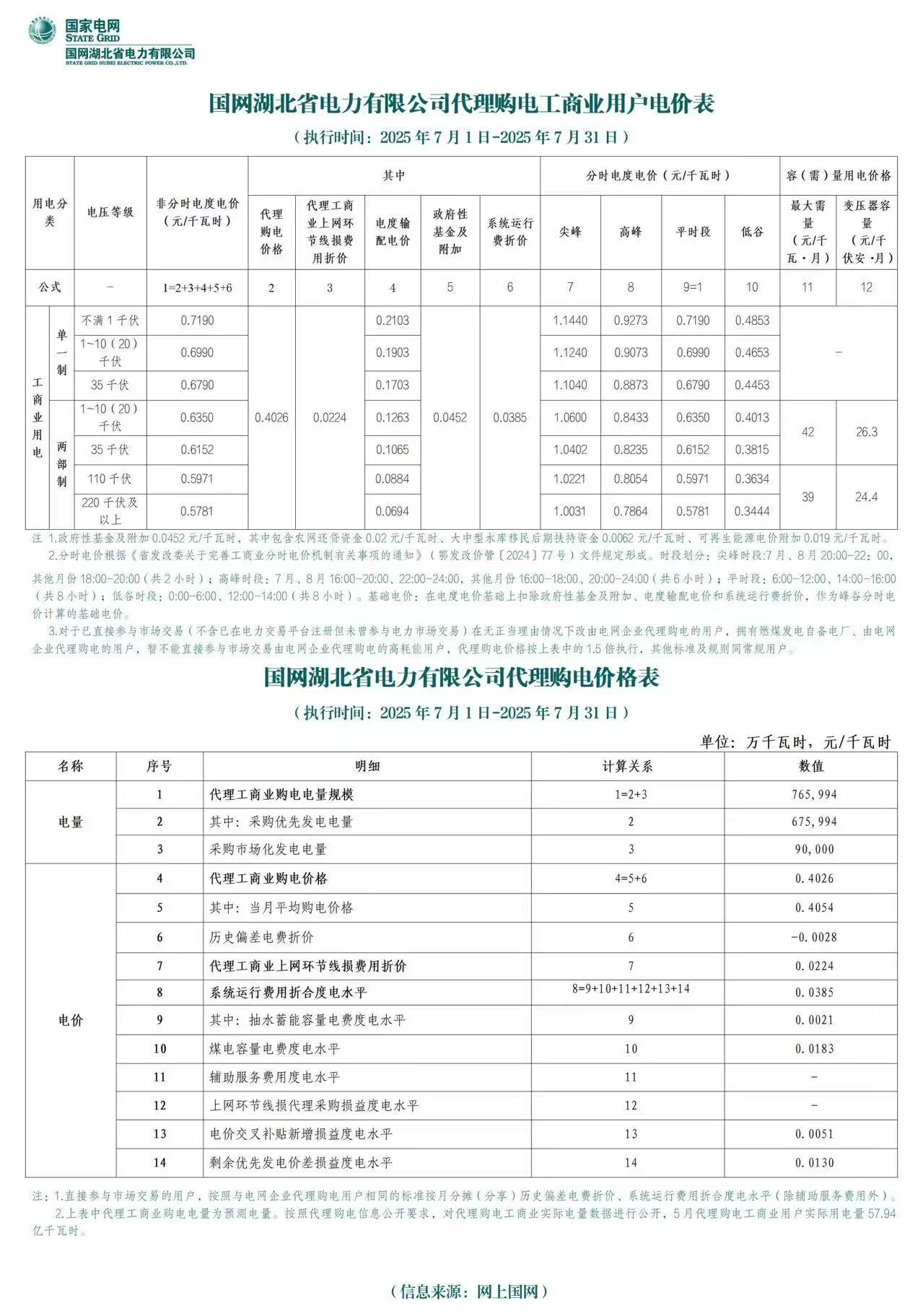 国网湖北省电力有限公司代理购电工商业用户电价表