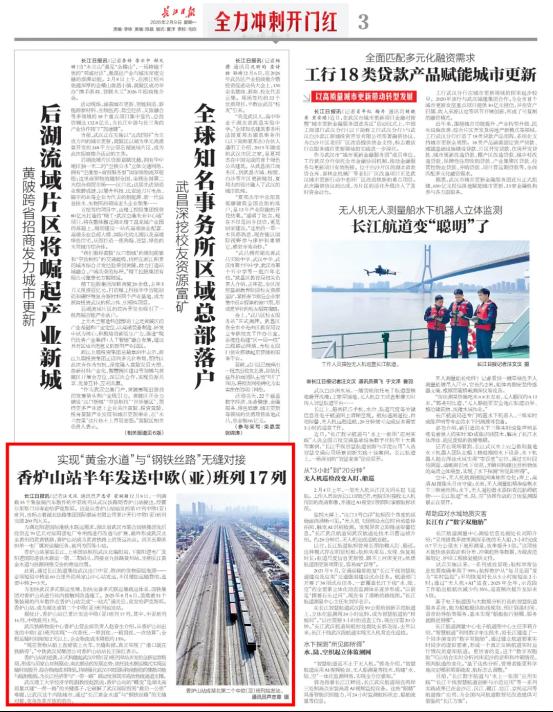 2月9日,长江日报刊发报道《实现“黄金水道”与“钢铁丝路”无缝对接 香炉山站半年发送中欧(亚)班列17列》,现予全文转载。